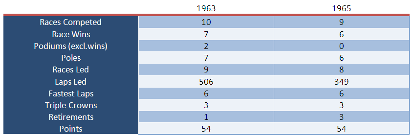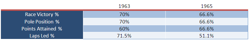 Overall, given the facts present, the 1965 season was the better year for Jim Clark. Not only had he improved upon his qualifying performance, he was more efficient when it came to picking up points in the races he could finish within his control (no D.N.F’s) with the average points per race being higher in 1965 than in 1963. Although his winning record percentage was lower in 1965 than in 1963, the deficit could’ve been made up with one more race win notably at Monaco where he wasn’t actually there to compete and at which he won at another venue. The final reason as to why 1965 was the better year for Clark was his 6 grand slams in one season and 5 in a row. To get a single grand slam is a great achievement but to get 6 in one season is mind blowing given how hard they are to achieve. None of this should detract however from the driving genius that was Jim Clark. Had he not sadly died in that F2 race at Hockenheim in 1968, and had been dealt better luck, another championship would’ve surely fallen his way. Out of his 2 though, 1965 serves to present Jim Clark in the clearest light.