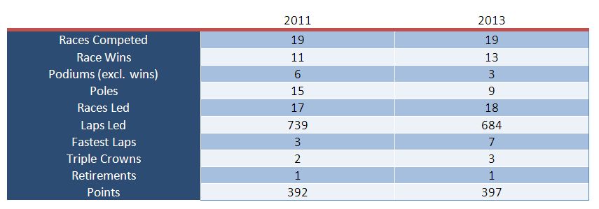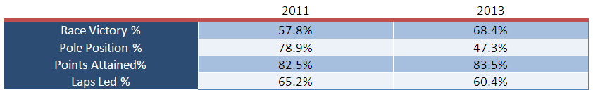 There are examples from both years of victories that could’ve been and shouldn’t have been. Canada 2011 would’ve been 6 out of 7 but on the last lap Vettel dipped a tyre off the dry line and half-spun, doing well to hold it, after pressure from Button who was closing in. Vettel ended up in 2nd. The final two races of the year also were hampered by problems. In Abu Dhabi Vettel started from pole but picked up a mysterious right rear puncture that is yet to be fully explained at turn 2 on lap 1 that resulted in suspension damageĀ (some people say it was hot exhaust gases directed to the rear diffuser that passed by the rear tyre that weakened the tyres structure, others say his run over the curb on the exit of turn 1 could’ve caused the puncture) and Vettel’s first retirement of the year and the first since Korea 2010. In Brazil Vettel was leading but hit a gearbox problem which allowed Webber to take the win. Vettel brilliantly brought the car home for 2nd however. In 2013 a win that got away was the British Grand Prix. After several tyre failures Vettel found himself in the lead but a gearbox failure forced him to retire. Given that Red Bull’s tyre wear was better than that of the Mercedes (Red Bulls closest challenge that weekend) it is to expected that Vettel would’ve won. Earlier that year there was a race that should’ve gone the way of Webber not Vettel. The imfamous ‘Multi 21’. Had Vettel obeyed team orders he would’ve finished 2nd.