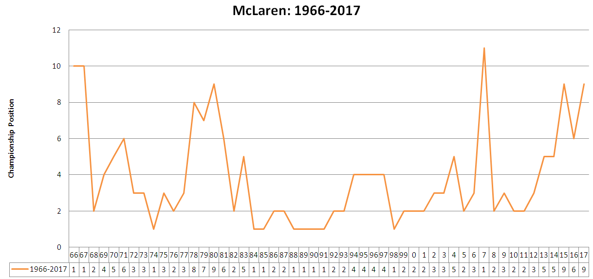 McLaren are a storied and successful team in the F1 paddock and are the second longest participating behind Ferrari who have been in the sport from the very beginning. Post-Senna’s Adelaide victory in 1993 they actually became the most successful F1 team in history (Ferrari had 103 wins from 521 races whilst McLaren had 104 from 394), this was until the Schumacher/Ferrari era in the 2000’s. Even though they are the second most successful team in the sport it has rarely been smooth sailing for McLaren even when things were going their way (to be fair nothing is smooth sailing in F1). From the late 70’s/early 80’s to the mid-90’s and mid-00’s there have been some years in which McLaren have looked nothing short of underwhelming to say the least. This piece will take a look at some of those years and will present facts and statistics to give context on how bad these years were for a team that should be in championship contention each year.