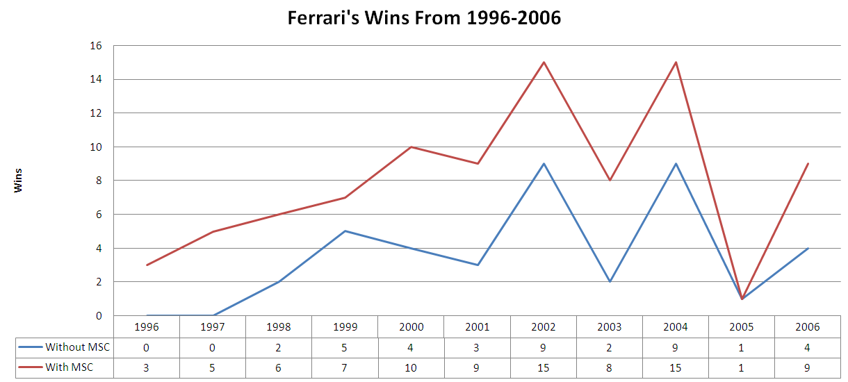 Ferrari are the most historic and successful team in Formula One history having been competing since the beginning in 1950 and amassing 15 drivers titles and 16 constructors titles. The image of the ‘Prancing Horse’ and the scarlet red cars is one of the most historic in any sport let alone F1. But despite this I believe the modern image of Ferrari in F1, concerning the ability to win rather than the brand image alone, is heavily reliant on Schumacher and his 11 year stint at the team which ended with 6 constructors championships and 5 drivers championships in a row rather than all the other years of its history. On top of this I believe that McLaren and Williams (F1’s other historic teams) could hold a candle to Ferrari on a more regular and legitimate basis had the Scuderia been without Schumacher and subsequently the majority of the success of the 2000’s as well as the extra years they were able to compete in from the 50’s and 60’s. This piece aims to analyse these statements and to show that once a wider look of F1’s history is had, Ferrari aren’t the all successful giant they are so hastily seen and believed to be.