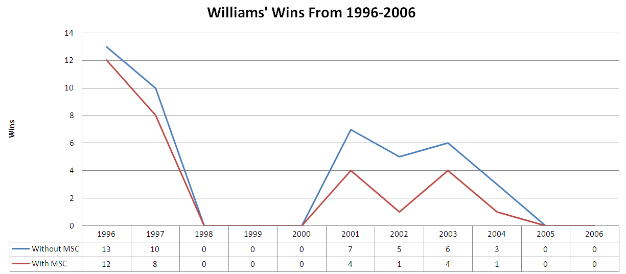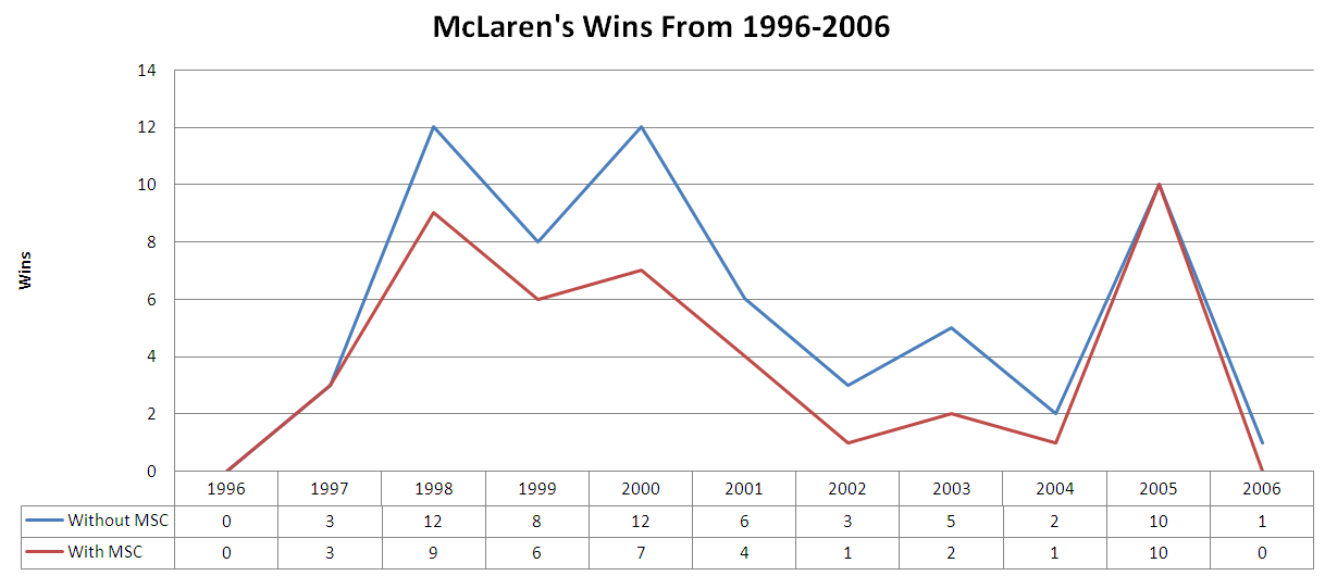 McLaren are, historically, Ferrari’s closest challenges with the two teams fighting for the championship on 11 occasions, ’72, ’75, ’76, ’85, ’90, ’98, ’99, ’00, ’03, ’07 and ’08 (these are when the two teams are each others closest challengers and that there was actual competition which eliminates the likes of 2001 as Schumacher won the title by 58 points over Coulthard). It is therefore of interest to see how McLaren’s fortunes would turn out if Schumacher hadn’t raced for the Scuderia. From their beginning in 1966 McLaren have won 182 races which is the second highest of any team. If we remove Schumacher from the years 1996-2006, like we did with Ferrari, McLaren would end up with a total of 200 wins. Its an increase of 18 and given that Ferrari’s win total would be 168 in the same scenario it helps, once again, to put the importance of the 90’s and 00’s into perspective for Ferrari. Take away the entirety of the period 1996-2006 then McLarens win total would be 139, 12 more than Ferrari in the same scenario. With Schumacher absent from Ferrari it would also open the door for McLaren to take some titles they didn’t do otherwise. Titles such as 2000 and 2001 would have surely been won by Haikkinen and Coulthard respectively. Raikkonen would likely have picked up a championship in 2003 and without Ferrari being such a close competitor in 2007 either Hamilton or Alonso would’ve won that years title. With the added monetary benefits from winning championships who knows what success McLaren could’ve had on top of what they have had since 2008.